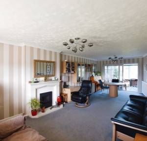 A large, carpeted reception room space with window to the front aspect and sliding patio door to the conservatory at the rear. Offers space for dedicated sitting and dining areas with a fireplace with stone surround and mantelpiece above.