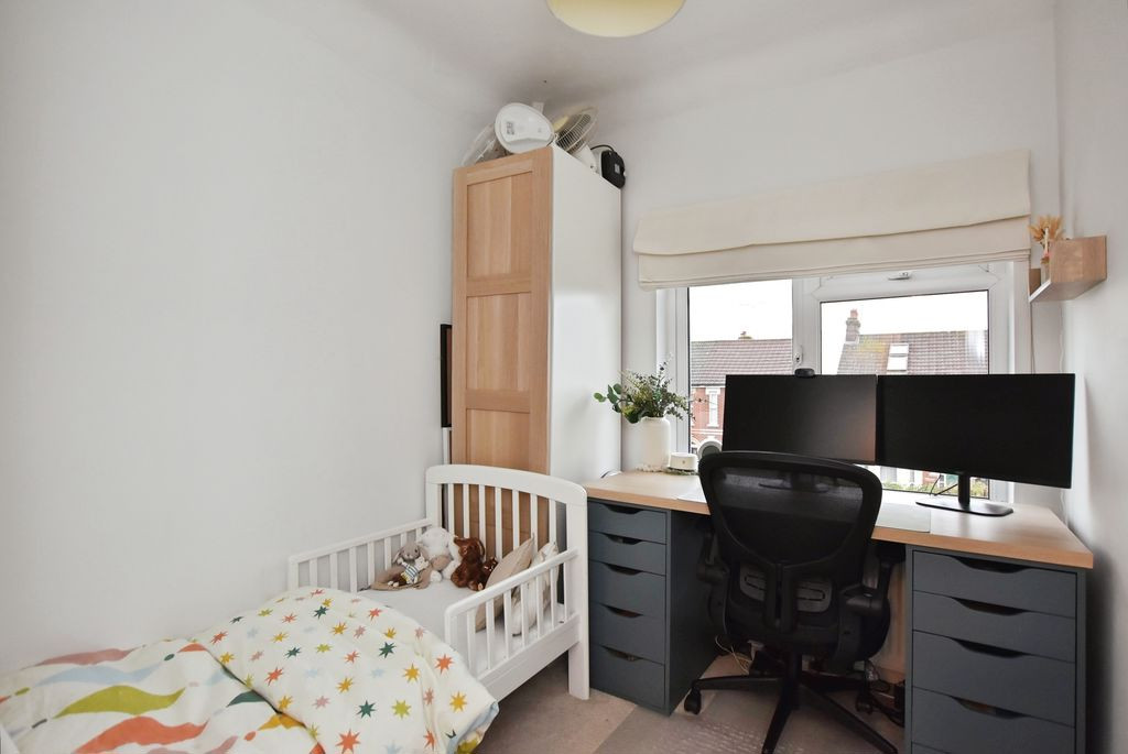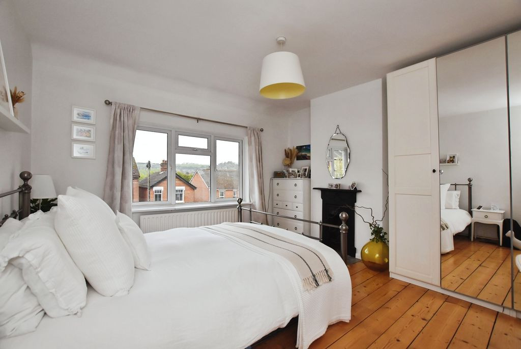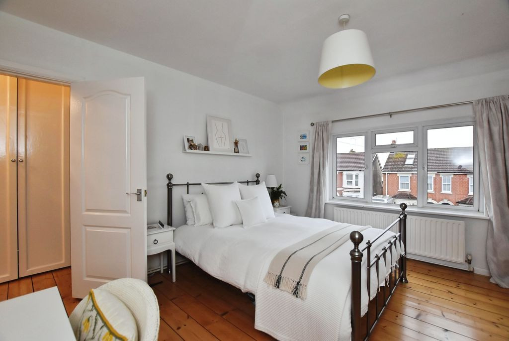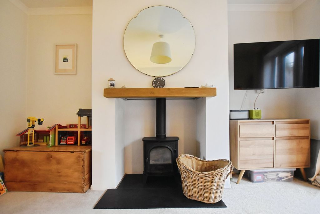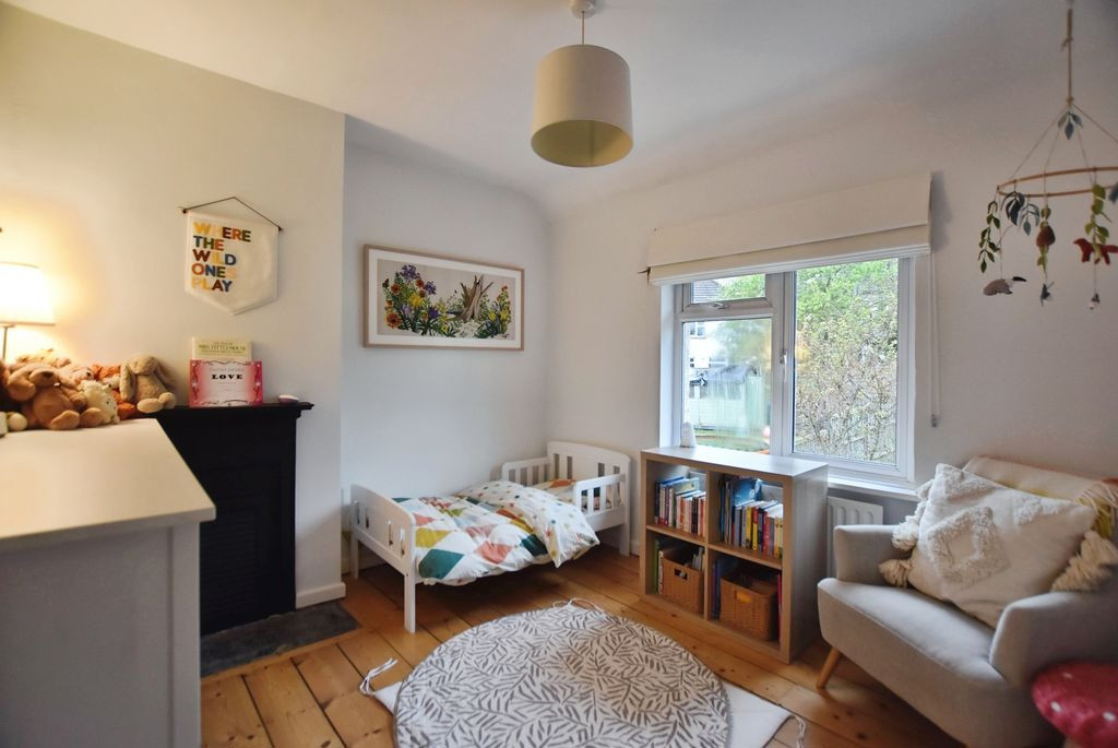 To the first floor, there are three bedrooms and a well-appointed family bathroom. The principal bedroom is positioned to the front and features original floorboards, a cast iron fireplace and three windows, providing an abundance of natural light. The second bedroom, overlooking the rear garden, is another well-proportioned double, also retaining character features including exposed floorboards and a fireplace. The third bedroom is a comfortable single room, ideal as a child’s bedroom or study. The family bathroom is finished in a modern style, fully tiled and fitted with a bath and shower over, WC and wash hand basin with storage, along with two rear aspect windows.