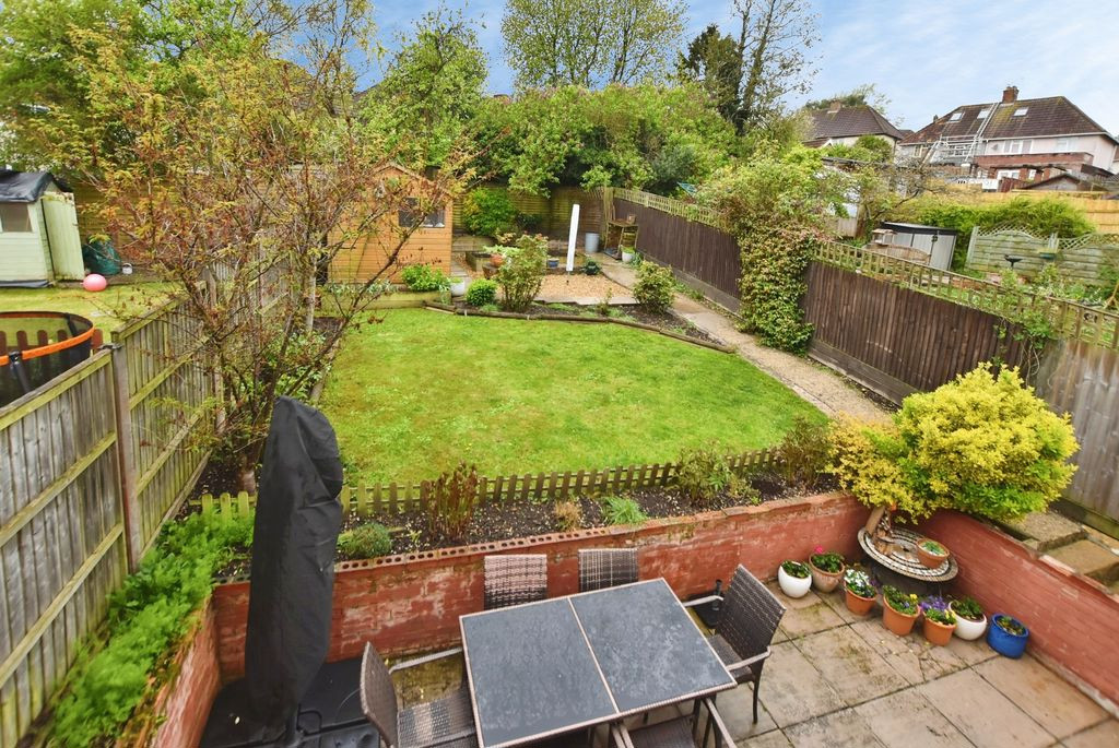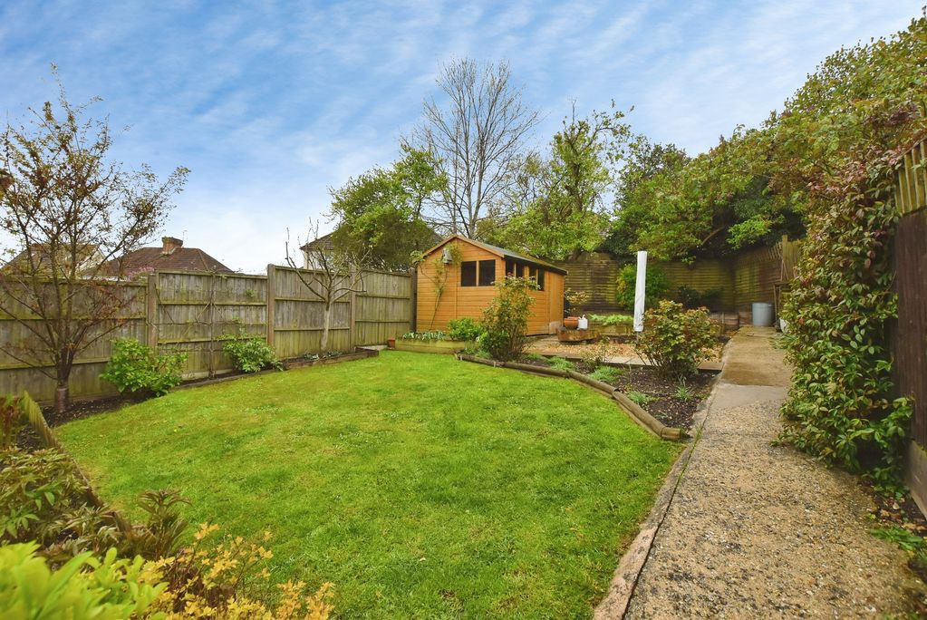 The rear garden is a particularly attractive feature, offering a good degree of privacy and a generous layout. Immediately adjoining the house is a patio area, ideal for outdoor dining and entertaining, leading onto a lawn with well-stocked flower beds. To the rear, there is a timber shed and a productive vegetable garden area.