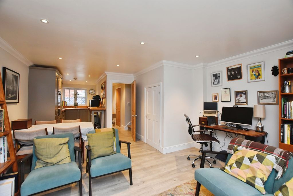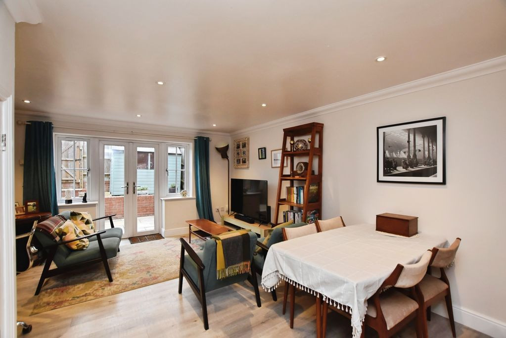 The principal reception space is an elegant open-plan sitting and dining room, a bright and welcoming environment enhanced by generous proportions and excellent natural light. Patio doors open directly onto the rear garden, creating a seamless connection between inside and out, ideal for both everyday living and entertaining. A useful understairs cupboard offers discreet and practical storage.