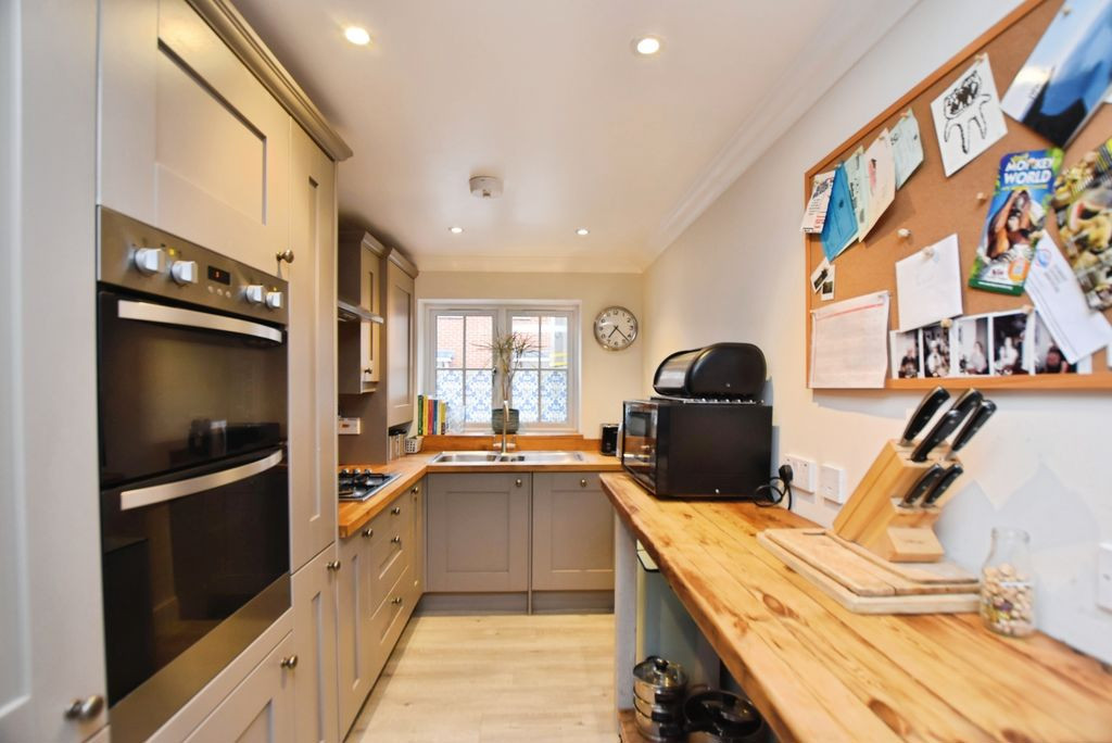 The kitchen is fitted with a comprehensive range of shaker-style wall and base units, complemented by wooden worktops and a full suite of integrated appliances. The space has been carefully planned to maximise both functionality and aesthetic appeal, providing a well-balanced environment suited to modern lifestyles. The ground floor further benefits from gas-fired underfloor heating, alongside LED downlighters and high-quality wooden flooring, all contributing to a refined and cohesive finish.