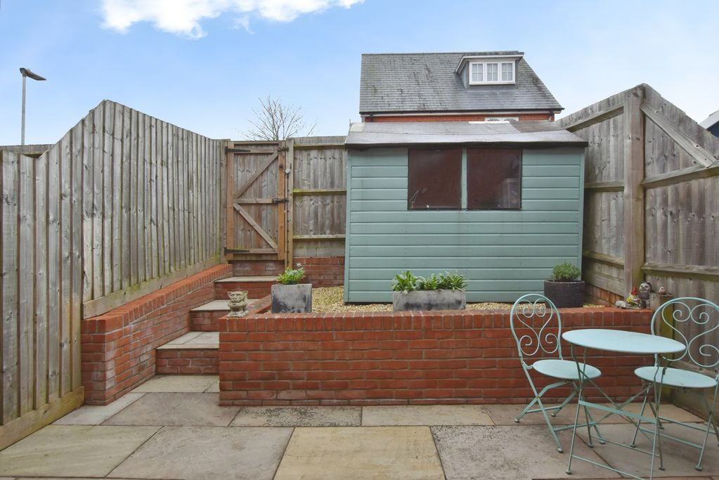 Externally, the rear garden has been designed with ease of maintenance in mind, featuring a combination of paved patio and shingled areas. This creates a practical yet attractive outdoor space, ideal for al fresco dining and entertaining. A timber shed provides useful external storage, while a rear gate offers convenient access to the parking area, where the property benefits from an allocated space.