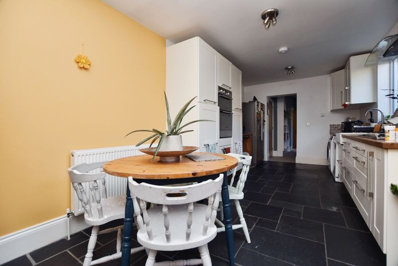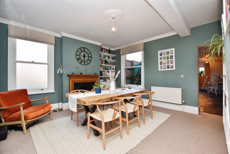 The entrance hall, with its attractive Welsh slate flooring and graceful archway, provides an immediate sense of character. The principal reception rooms retain a wealth of period features, including decorative ceiling roses, picture rails and fireplaces. The sitting room enjoys a deep bay window to the front and a wood-burning stove set within a traditional surround, while the adjoining dining room is dual aspect and features a further period fireplace, ideal for both formal dining and relaxed family gatherings.