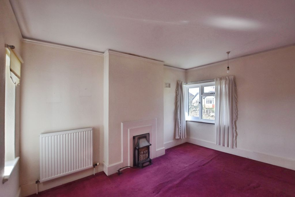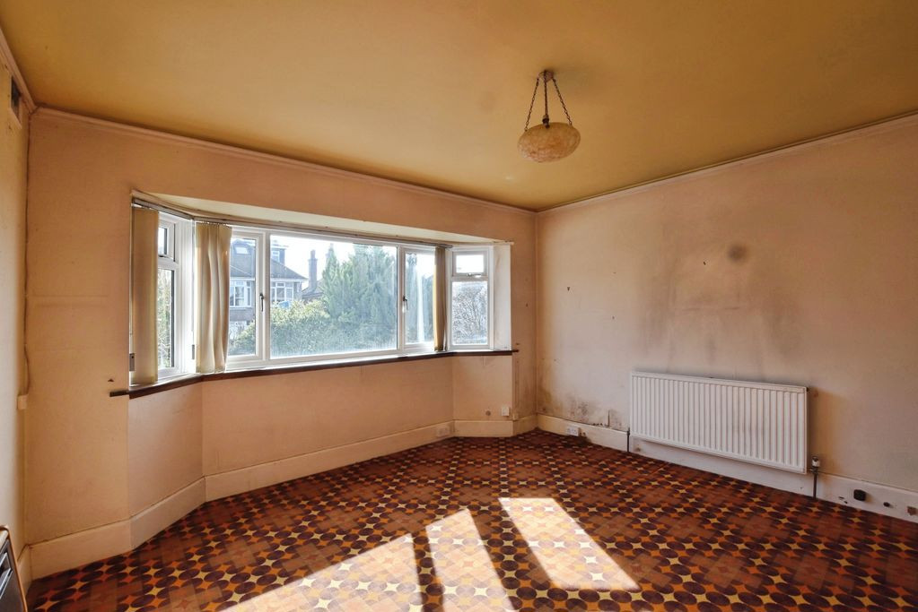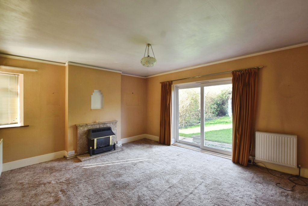 To the front, the dining room is distinguished by a broad bay window, lending excellent natural light and proportion. The principal sitting room spans the depth of the house and enjoys a dual aspect, with sliding glazed doors opening directly onto the garden. A fireplace provides a focal point, and the room offers considerable scope for redesign in line with contemporary living preferences.