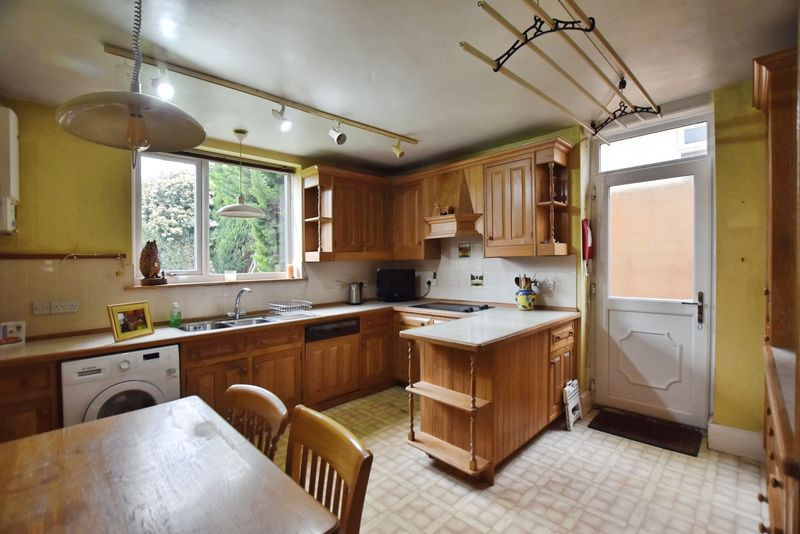 The kitchen overlooks the rear garden and is fitted with timber-fronted cabinetry and work surfaces, incorporating integrated oven, hob and dishwasher, together with space for additional appliances. A ground floor cloakroom completes the accommodation at this level.