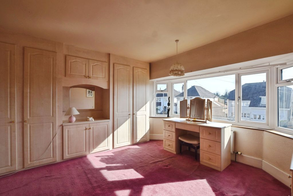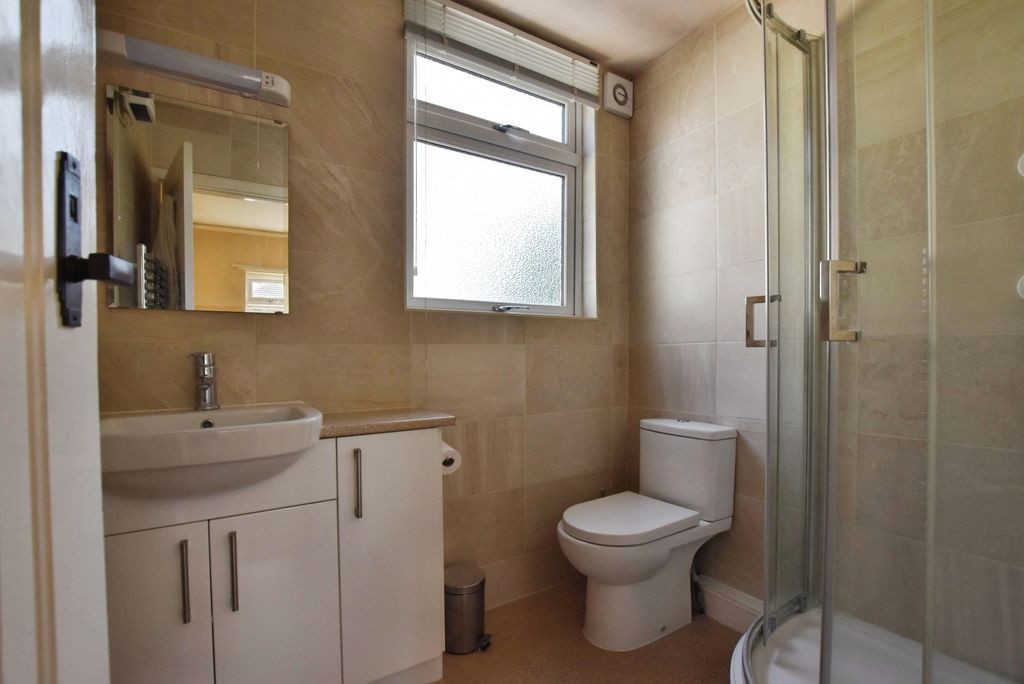 Upstairs, four bedrooms are arranged off a spacious landing. The principal bedroom is particularly generous, featuring a large bay window to the front and an extensive range of fitted storage. Two further double bedrooms benefit from corner aspects, enhancing light and outlook, while the fourth bedroom is a well-proportioned single overlooking the garden. A family shower room serves all four bedrooms. There is also an airing cupboard and access to the loft space.