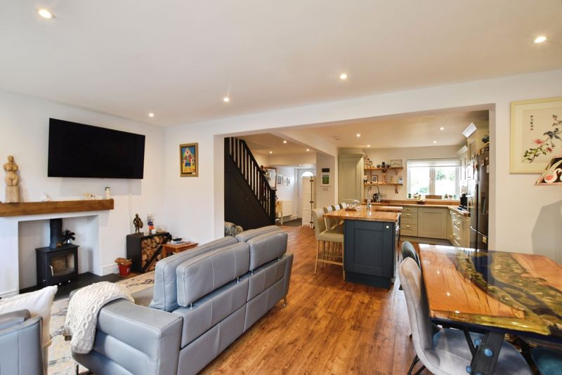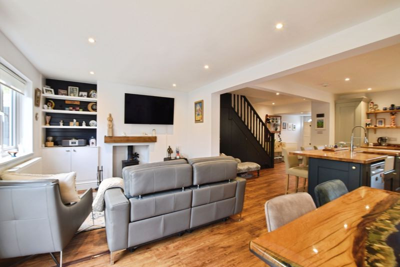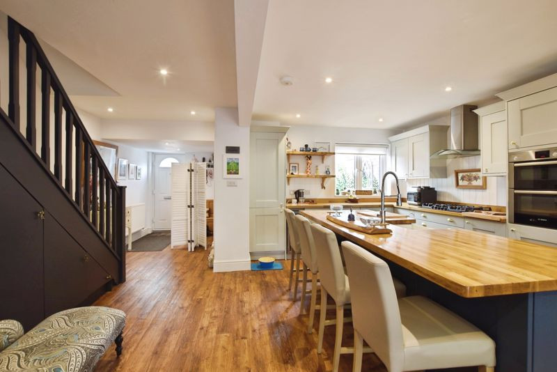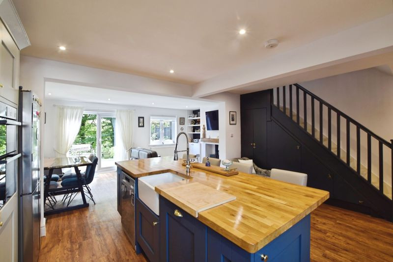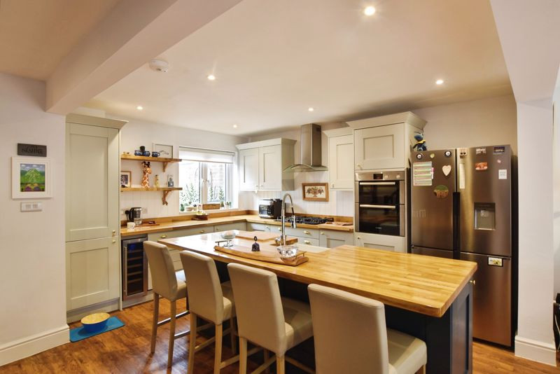 The ground floor is centred around the impressive open-plan kitchen, dining, and living space. The kitchen is a striking contemporary design, with an extensive range of wall and base units, complemented by solid wooden work surfaces. Integrated appliances include a five-ring hob with extractor and a double eye-level oven, with further space for a large fridge freezer, dishwasher, and washing machine. A substantial breakfast bar with a solid wood counter provides casual dining space and a focal point for entertaining.