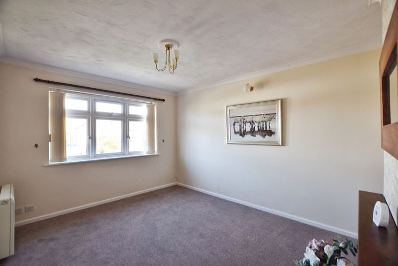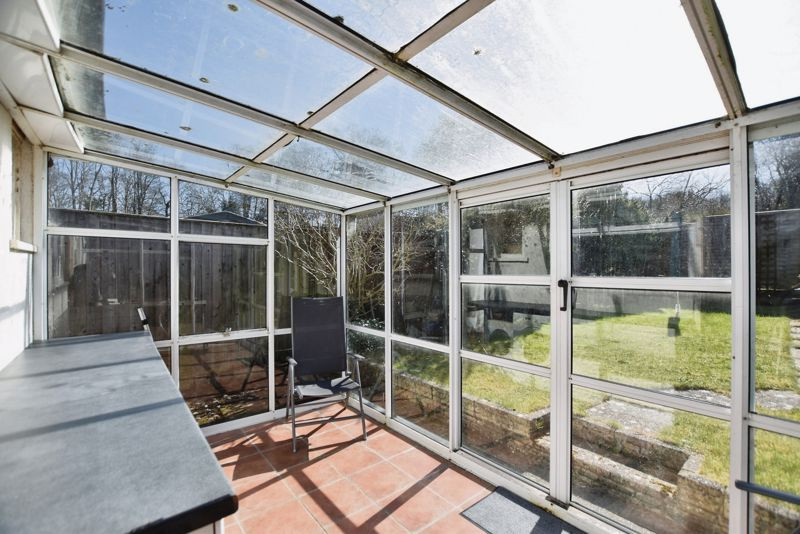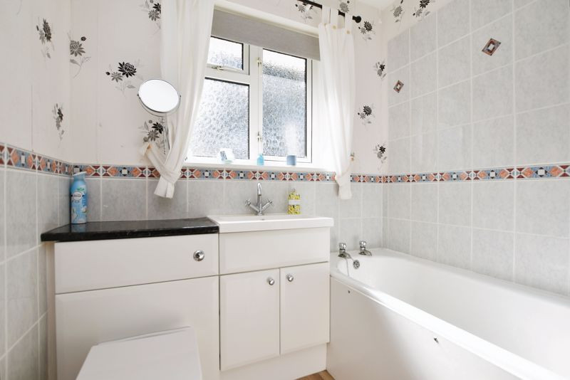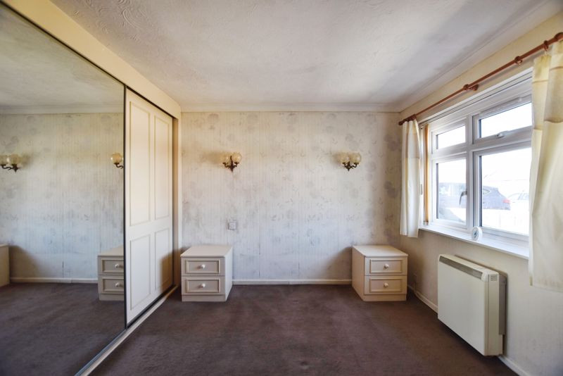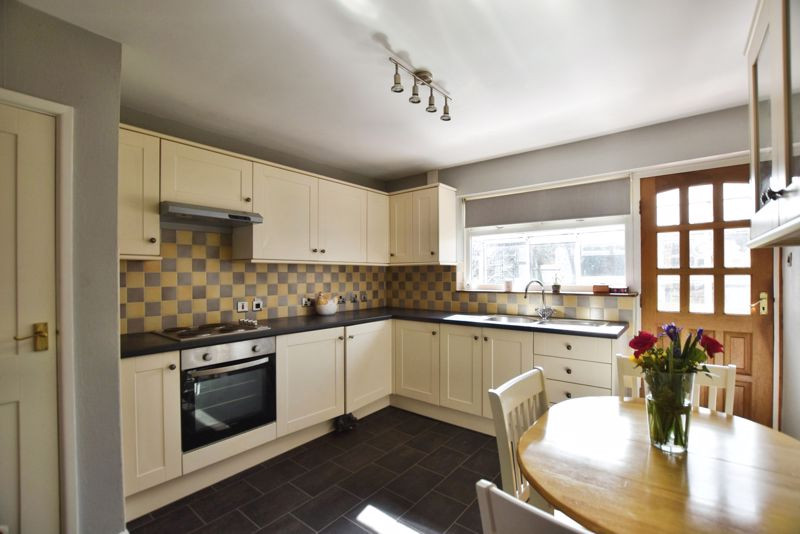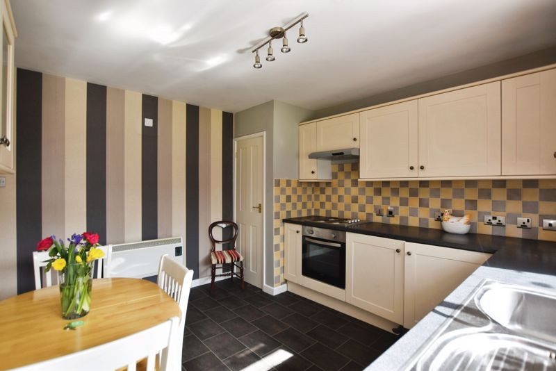 On the right, the first bedroom is a bright and spacious double room, complete with ample built-in storage. Further along the hallway, the kitchen is positioned towards the rear of the home. Tastefully designed, it features matching base and wall cabinets, a slate-effect worktop, and a stainless-steel sink. Integrated appliances include an electric hob with an extractor above, an electric oven, and a fridge freezer. There is ample space for a breakfast table, and a useful larder cupboard adds extra storage. A door leads from the kitchen into the conservatory, which offers additional units and plumbing for a washing machine.