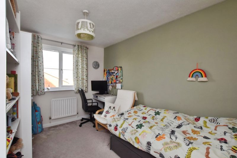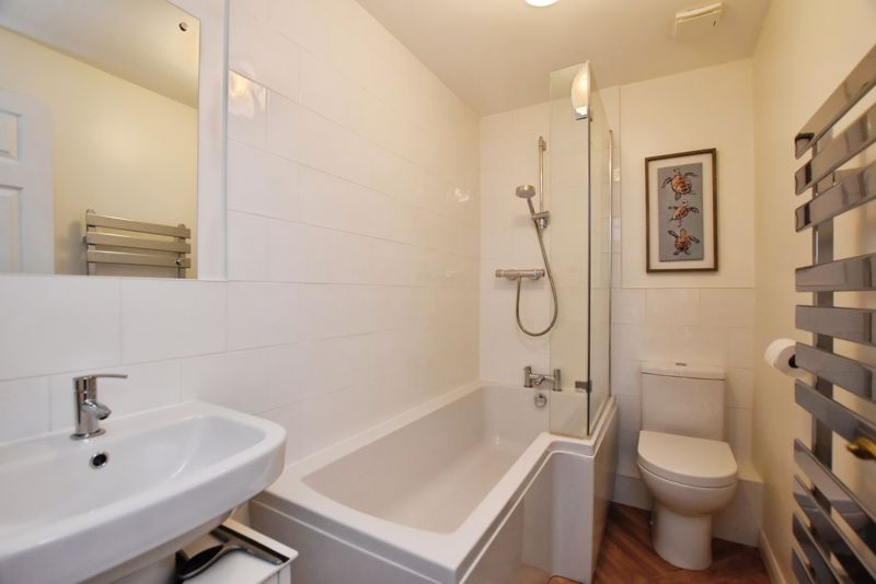 On the first floor, the principal bedroom benefits from built-in wardrobes, twin front-facing windows, and a modern en suite shower room. Two further bedrooms enjoy views over the rear garden and the valley beyond, and are served by a contemporary family bathroom fitted with a P-shaped bath with thermostatic shower over, hand basin, WC, and tiled surrounds.