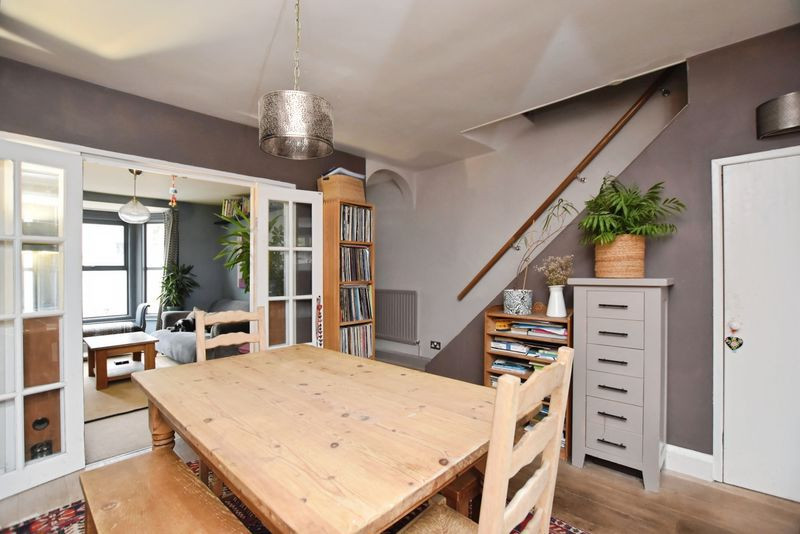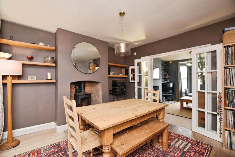 The property is approached via a low rendered brick wall with a gravelled frontage, providing an attractive setting for planted pots and offering a sense of privacy from the street. Steps lead to a recessed, covered entrance porch which opens into a welcoming entrance hall. From here, the accommodation flows naturally into a well-proportioned dining area, featuring a wood-burning stove and a rear-facing window overlooking the garden, creating a warm and inviting space suitable for both everyday living and entertaining. Double doors open into the principal sitting room, a light-filled and comfortable space enhanced by a bay window and a second wood-burning stove, offering a refined yet cosy environment. Steps from the dining area rise to the kitchen, which is fitted with wooden cabinetry and enjoys pleasant outlooks over the rear garden. Sliding doors lead through to a glazed storage room, providing a practical intermediary space and direct access to the garden.