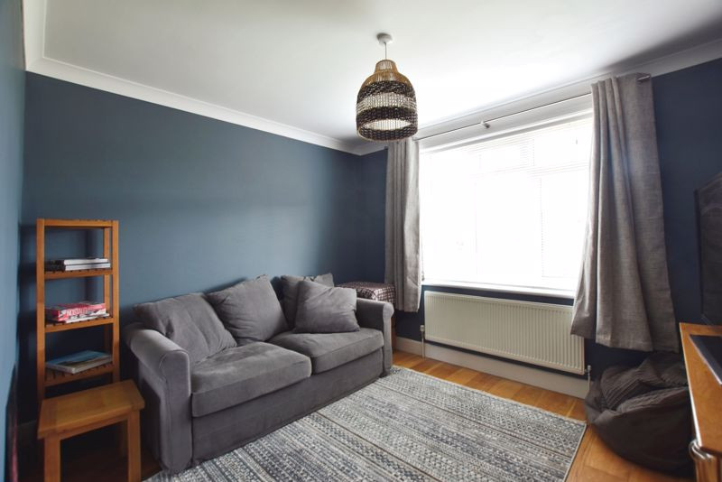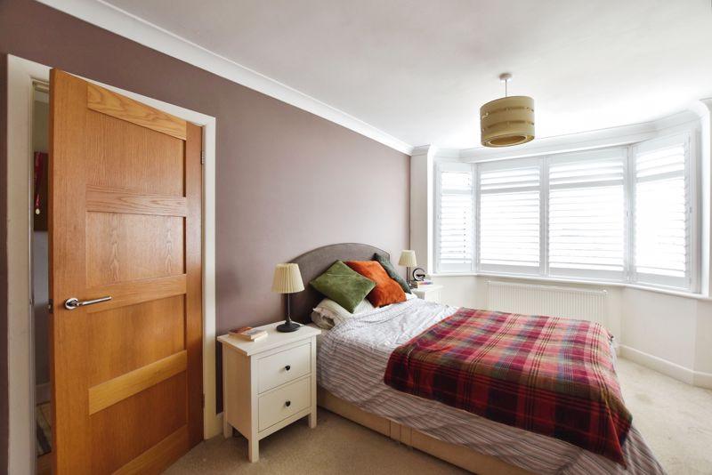 The principal bedroom is well-proportioned, featuring a large, fitted wardrobe with mirrored doors, an additional storage cupboard, a corner fireplace, and a charming bay window that brings in plenty of natural light. An en-suite shower room includes a shower cubicle, wash hand basin, WC, heated towel rail, tiled flooring, and an electric shaver point. A second spacious double bedroom benefits from engineered oak flooring and ample natural light, while a third bedroom offers a versatile space, ideal as a study, home office, or guest room.