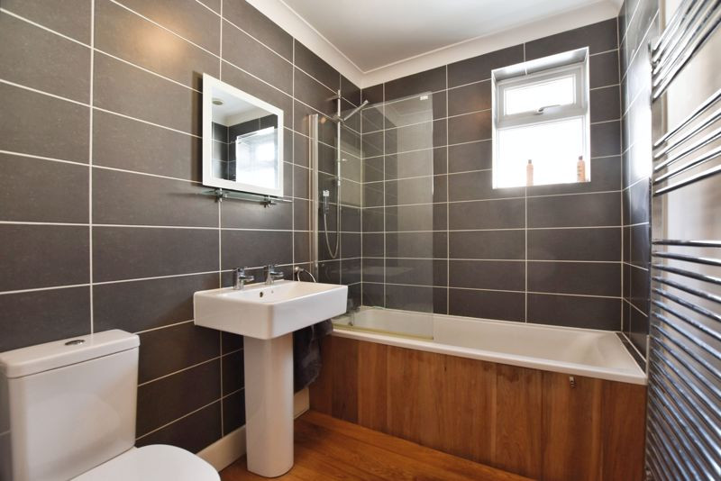 The family bathroom is fitted with a panelled bath and shower with a glass screen, a wash hand basin, WC, part-tiled walls, a heated towel rail, and a mirror, completing the homes well-planned layout.
