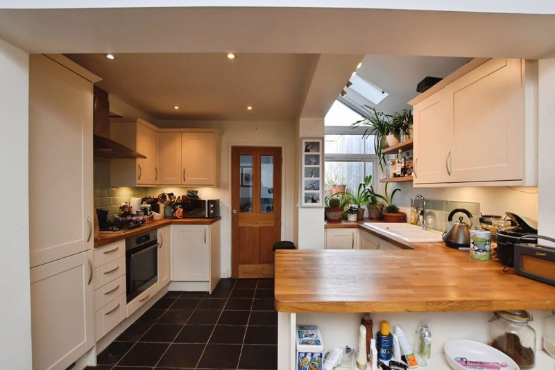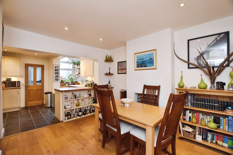 The entrance hall provides access to the principal ground floor rooms and a cloakroom, which features a vaulted ceiling and roof window, creating a bright and airy space. Double doors lead to the sitting room, an inviting reception area enhanced by an attractive chimney breast and bespoke shelving. Beyond lies the dining room, complete with a feature fireplace and useful understairs recess, which opens into the impressive part-vaulted kitchen. This striking room enjoys excellent natural light from twin roof windows and further glazing to the rear, and is fitted with a comprehensive range of units, generous work surfaces and dedicated space for all essential appliances. A side lobby with additional roof window leads directly to the rear garden.