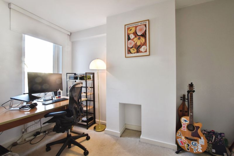 The first floor comprises two well-proportioned bedrooms. The principal bedroom includes high-quality fitted wardrobes, while the third bedroom features a charming original fireplace. The spacious family bathroom has been tastefully appointed with a four-piece suite, including a separate shower enclosure. The top floor is dedicated to an additional double bedroom, a generous and versatile space with elevated views and useful storage.