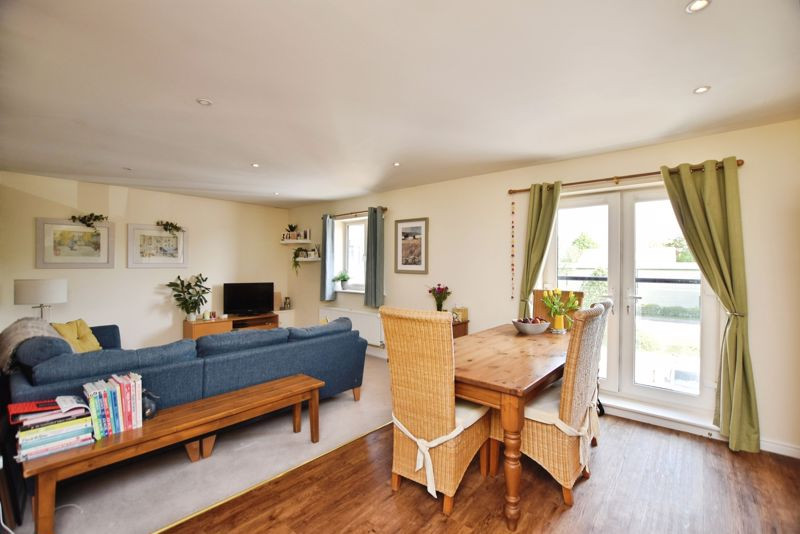 space is flooded with natural light from a window and a Juliet balcony to the front aspect, creating a bright and inviting atmosphere. The dining area comfortably accommodates a table and chairs, while the generous living space, carpeted for comfort, easily supports a range of seating arrangements, making it ideal for relaxing or entertaining.