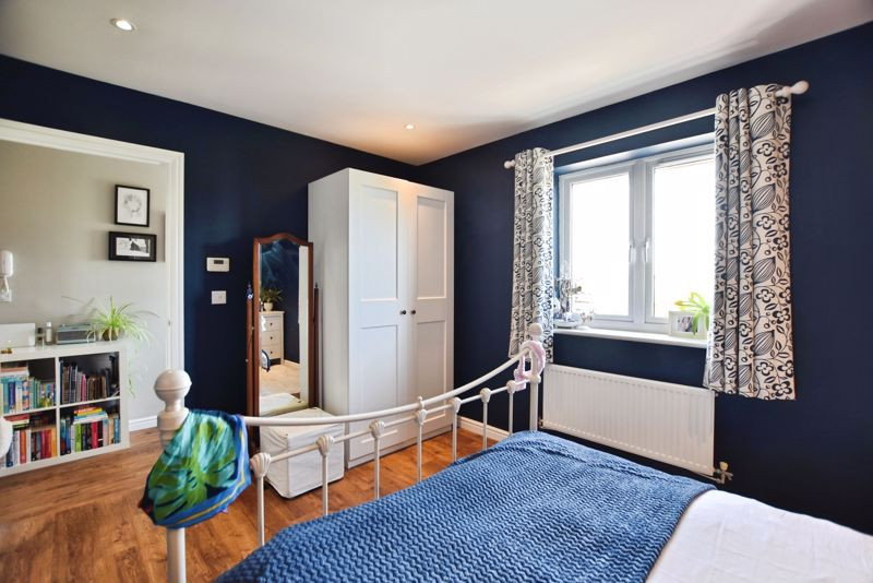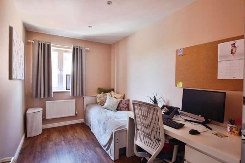The principal bedroom is a spacious double with a large window that brings in soft natural light. It offers plenty of space for a king-size bed, wardrobes, and additional furniture. The second bedroom is also well proportioned and is equally suited as a guest room, child's bedroom, or a home office, depending on your lifestyle needs. Both bedrooms feature the same attractive wood-effect flooring found in the hallway and kitchen, offering a stylish and cohesive feel throughout.