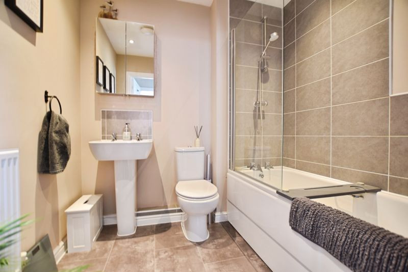 The family bathroom is smartly appointed, featuring a full-sized bath with shower over, a modern WC, and a wash hand basin. The walls are partially tiled, and the floor is finished in luxury vinyl, making this space both practical and visually appealing.