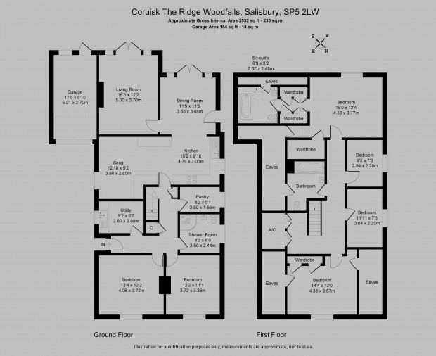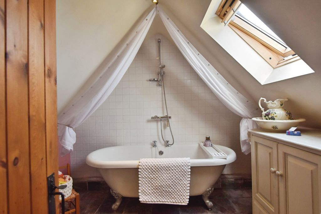 To the first floor, the property offers four further bedrooms and two bathrooms. The principal suite is a superb space, positioned to the rear and benefitting from a substantial walk-in wardrobe, extensive eaves storage, and a private en-suite bathroom, with rooflights enhancing the sense of light and space.