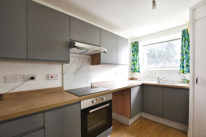 The well-equipped kitchen has a matching range of base and eye-level units with a beech-effect roll-top work surface. Features an integrated electric oven with a four-ring hob and extractor hood, a stainless-steel sink with drainer, and laminate flooring. A double-glazed window provides natural light. There is a large pantry cupboard for additional storage.