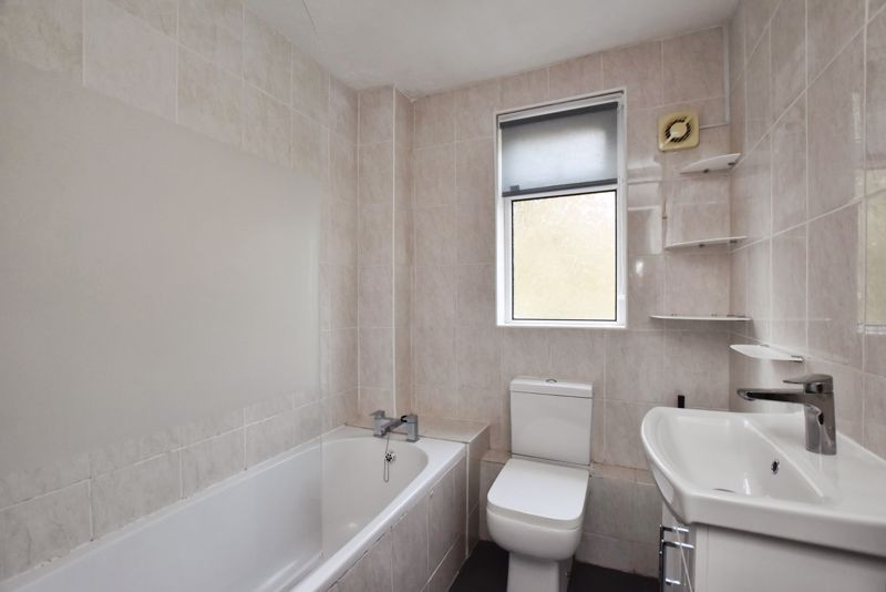 The bathroom is fitted with a modern white suite comprising a wall-mounted hand wash basin, WC, and a panelled bath with an over-head electric shower. The bathroom also benefits from an extractor fan, a double-glazed window with obscured glass, and full tiling.
