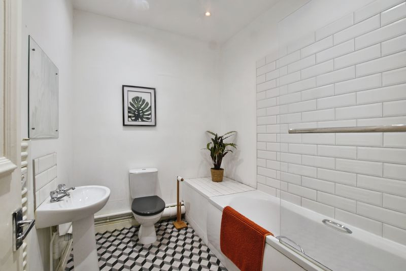 Three piece suite comprising of panel bath with twin taps, separate electric shower unit over bath with glass screen, tiled splash areas, low level WC, pedestal wash hand basin, inset spotlights to the ceiling, heated towel rail and extractor fan.