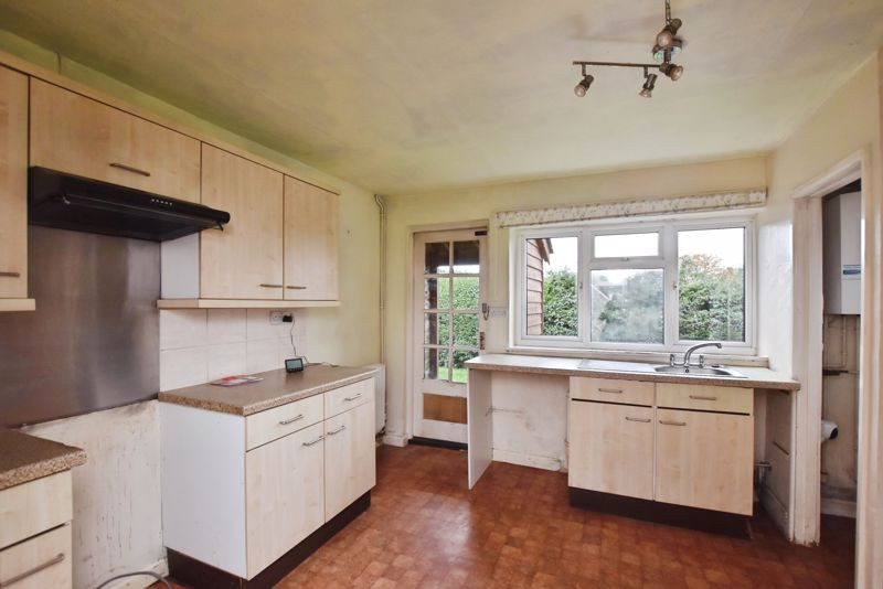 The kitchen, positioned at the rear of the property, includes a range of fitted cabinets, space for appliances, a window overlooking the garden, and a back door providing direct access outside. It offers excellent potential for redesign or enlargement to create a contemporary open-plan living space, subject to consents.