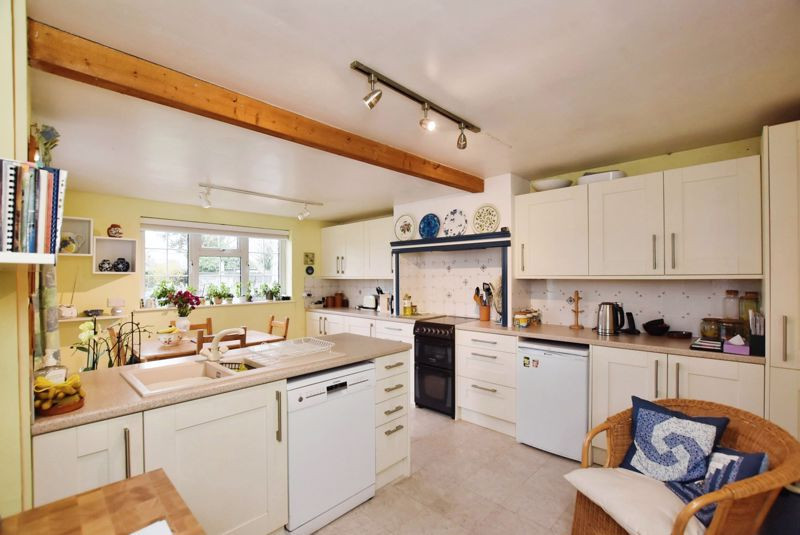 Tiled flooring with window to the rear and double patio doors to the garden at the side. Offers a range of high and low cabinet units with adjoining stone-effect worktops incorporating a one-and-a-quarter sink basin with drainer unit, and surrounding splashback tiling. Offers space for an electric cooker, fridge, and a dishwasher, as well as ample room for a dining table and chairs.