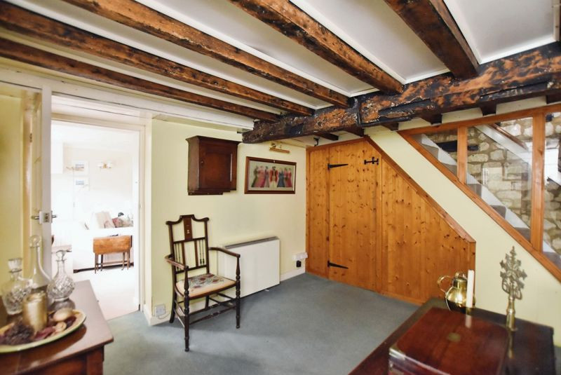 Front door opens to the central entrance hall with carpeted flooring and exposed timber beams above. Gives access to the sitting room and the dining room, as well as the first-floor landing via the stairs with under-stair cupboard.