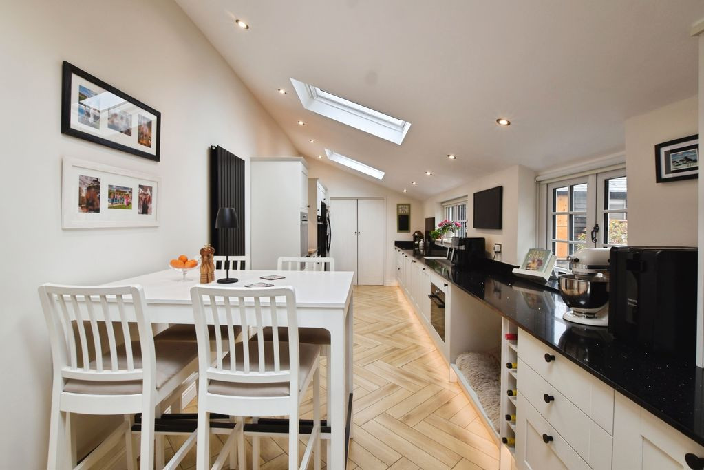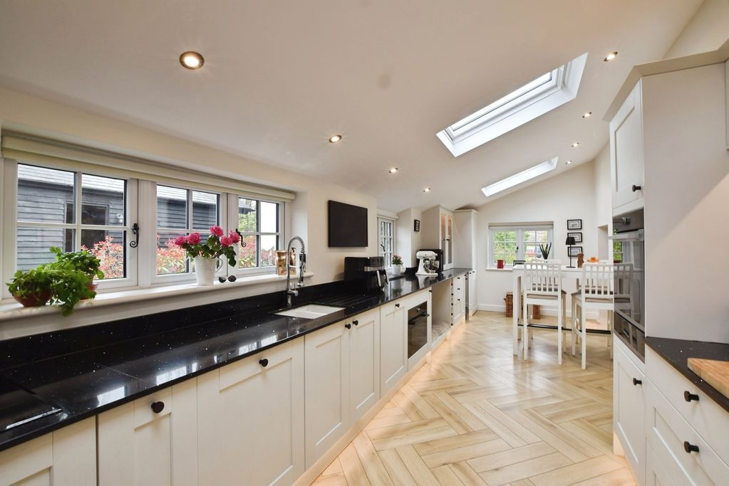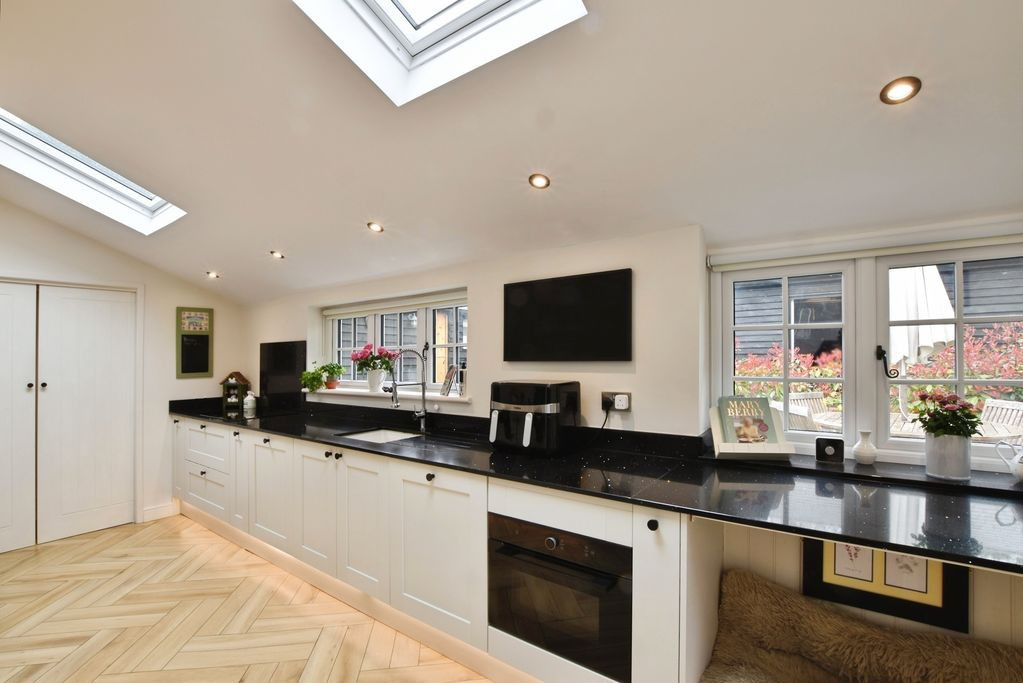The kitchen is a standout feature, thoughtfully designed with bespoke cabinetry set beneath quartz worktops and complemented by herringbone flooring. It is well-equipped with double ovens, induction hob, integrated microwave and dishwasher, as well as space for a large fridge freezer. Multiple Velux windows flood the space with natural light, while a dining area to the rear enhances its sociable appeal.