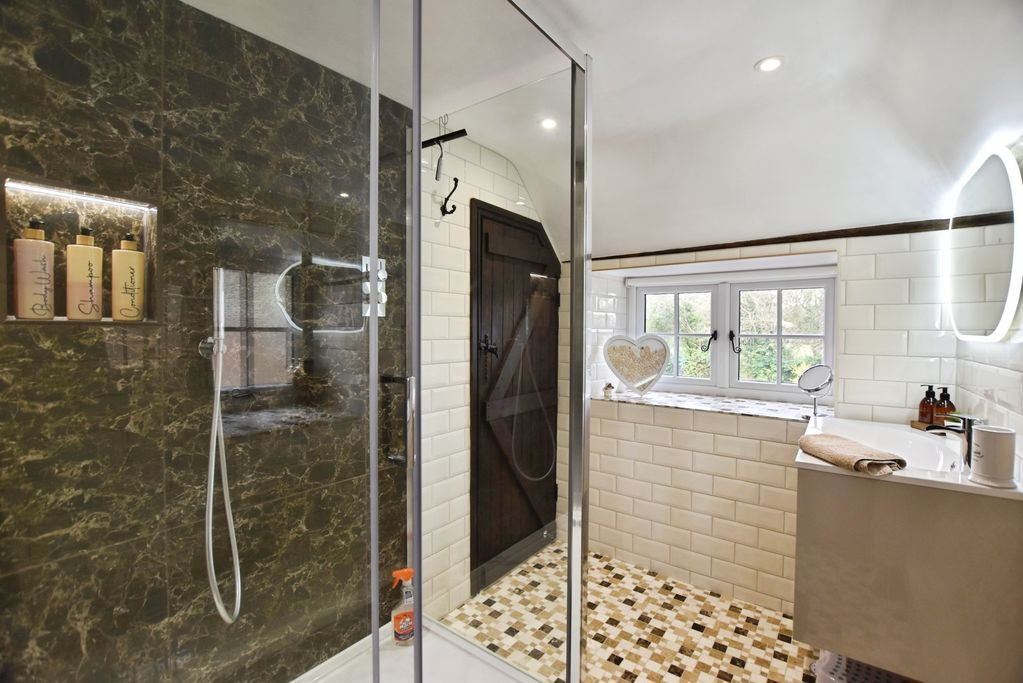 To the first floor are two further double bedrooms, each enjoying individual character features, served by a stylish and contemporary shower room fitted with a walk-in double shower, wall-hung basin with storage, WC and illuminated mirror.