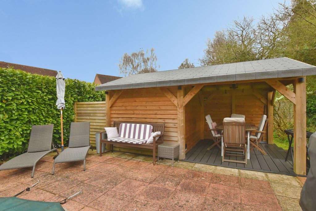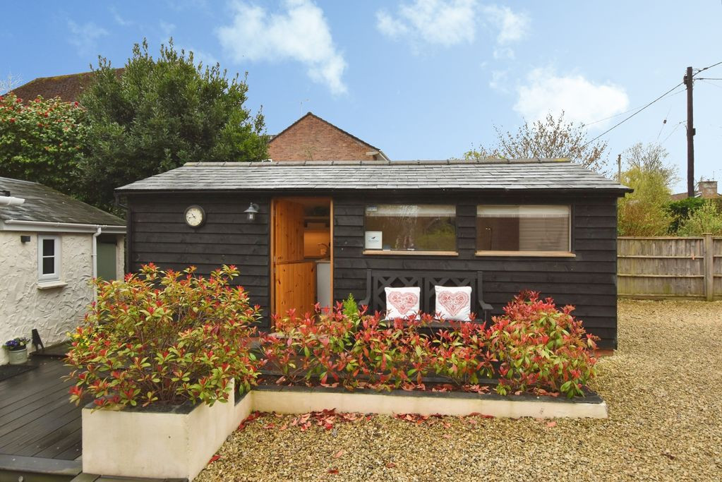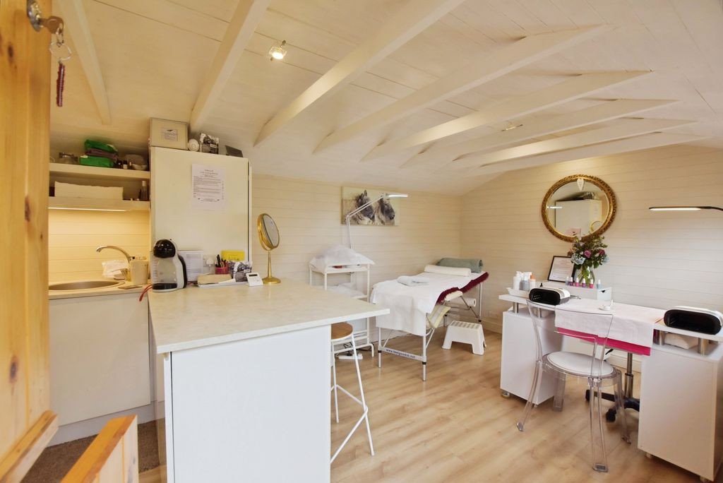 Approached via a timber gate, the property opens onto a substantial driveway providing ample parking for multiple vehicles, alongside a double garage with electric door. The frontage is enhanced by well-stocked rendered raised beds and a decked seating area, ideal for outdoor entertaining. A particularly versatile addition is the detached studio, currently arranged as a beauty salon and complete with a shower room, offering excellent potential for use as a home office, guest accommodation or self-contained annexe, subject to any necessary consents.