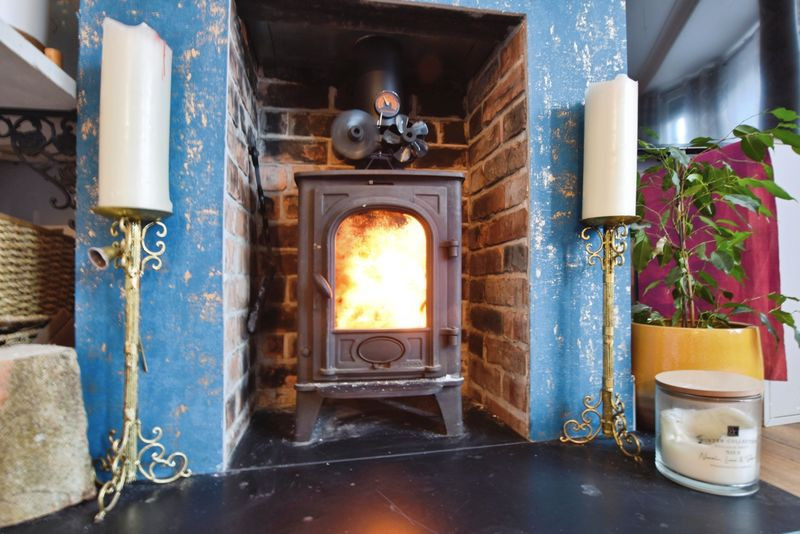 A central hallway links the main accommodation and includes a useful area well suited to a desk or additional storage. The sitting room is particularly inviting, centred around a wood-burning stove set on a stone hearth with a timber mantel, creating a warm yet refined atmosphere. A bay window to the front allows light to flood the room and further strengthens the connection to the riverside setting.