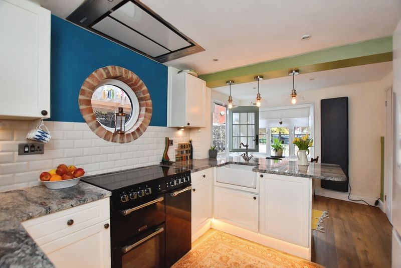 A characterful stable door opens directly into the kitchen, immediately setting the tone for the home. Generously proportioned and thoughtfully designed, the kitchen is fitted with a range of cabinetry beneath stone work surfaces, incorporating a ceramic sink and traditional-style tiled splashbacks. Stylish panelled wall detailing adds texture and visual interest, while a breakfast bar provides an informal dining option. There is ample space for a range-style cooker and full-height refrigeration, and a distinctive porthole window introduces both charm and natural light. Adjoining the kitchen is a highly practical utility room, offering additional worktop space and housing laundry appliances, ensuring the principal living areas remain uncluttered and functional.