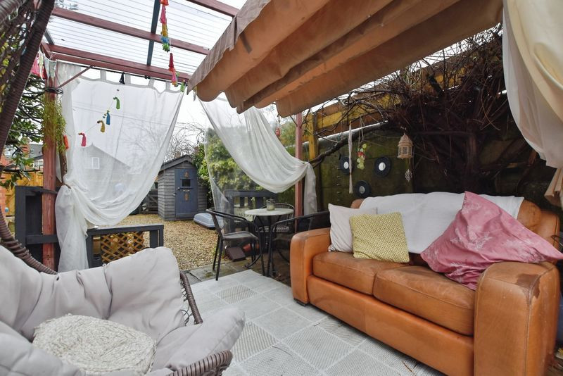 The apartment is approached via a secure timber gate, opening onto a delightful shingle forecourt framed by mature planting. Decorative trellis screening to the front boundary provides an additional layer of privacy while allowing light to filter through, creating a sheltered and attractive approach. This space offers room for parking or informal seating, with a garden shed providing useful additional storage. Beyond, a patio terrace with a covered seating area forms an inviting spot from which to enjoy the tranquil outlook and riverside ambience.