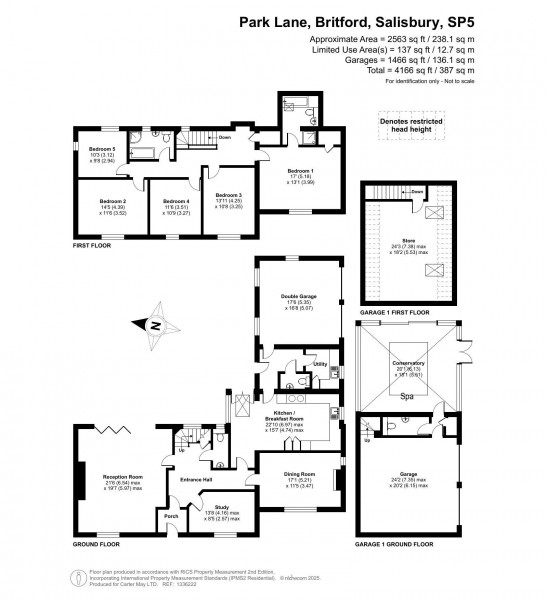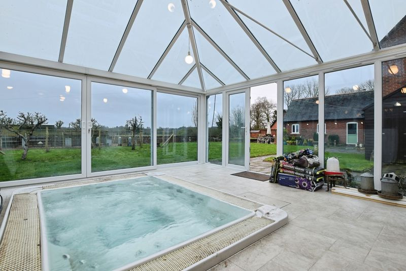 Externally, the property enjoys an attractive red-brick frontage with a lawned front garden framed by mature planting. A driveway to the side leads to one of two double garages, above which sits a versatile room offering further potential as storage or an office space. This garage connects to a charming conservatory or garden room/Spa, providing a peaceful vantage point over the garden.