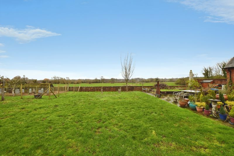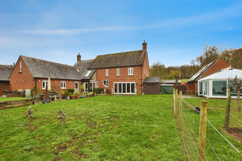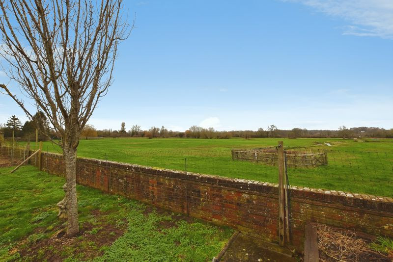 To the rear, doors from both the sitting room and kitchen/breakfast room open onto an expansive patio incorporating a decorative pond and ample space for outdoor entertaining. Beyond lies a substantial enclosed garden backing directly onto open water meadows, enhancing the sense of privacy and natural beauty.