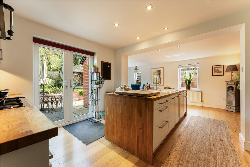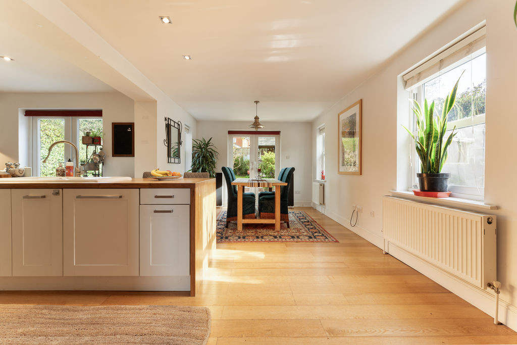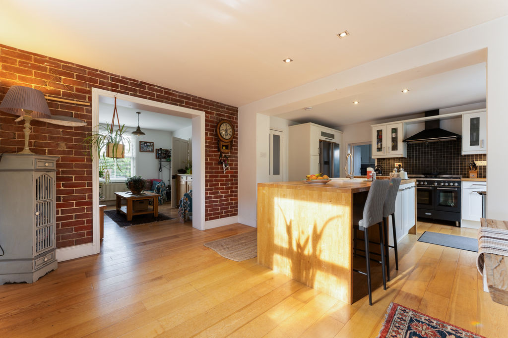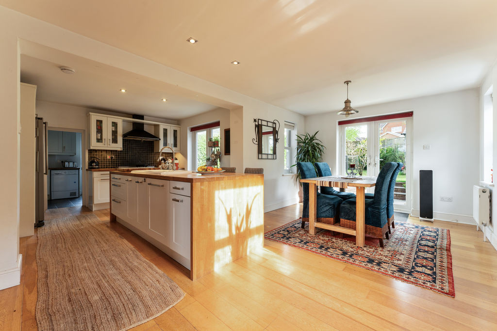 To the rear, the property opens into an impressive open-plan kitchen/dining/living area, thoughtfully designed for modern family life and entertaining. Finished with engineered oak flooring throughout, the kitchen is fitted with a comprehensive range of cabinetry topped with solid oak work surfaces, incorporating a central island with ceramic sink and breakfast bar seating. There is space for a range cooker and American-style fridge/freezer, alongside an integrated dishwasher. Natural light floods the space via dual-aspect sash windows and French doors, which open directly onto the rear patio, creating a seamless connection between indoor and outdoor living.