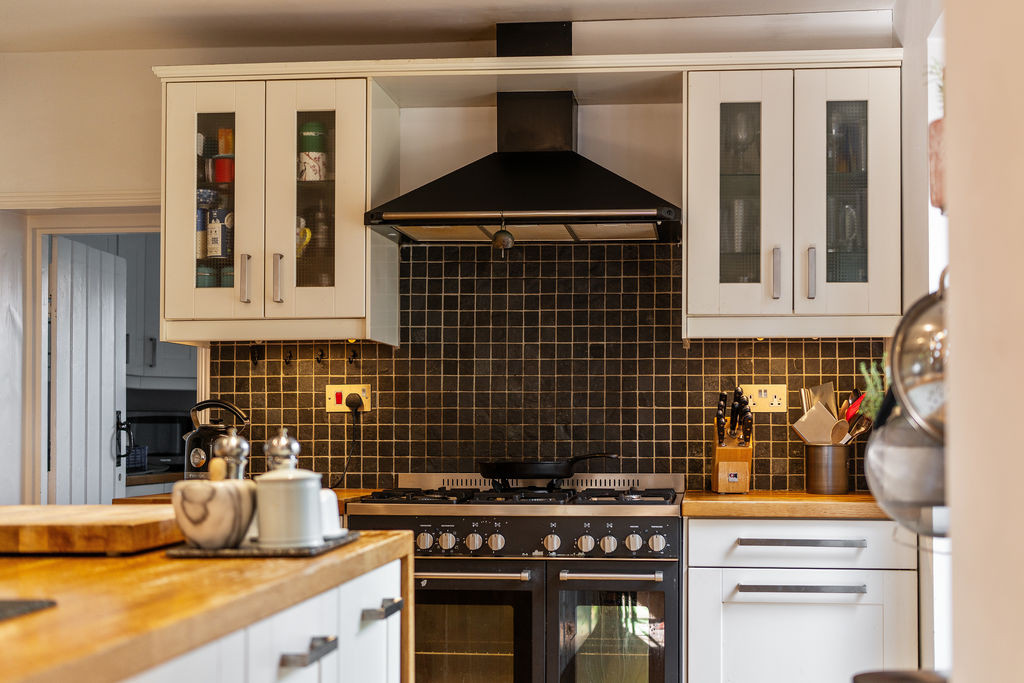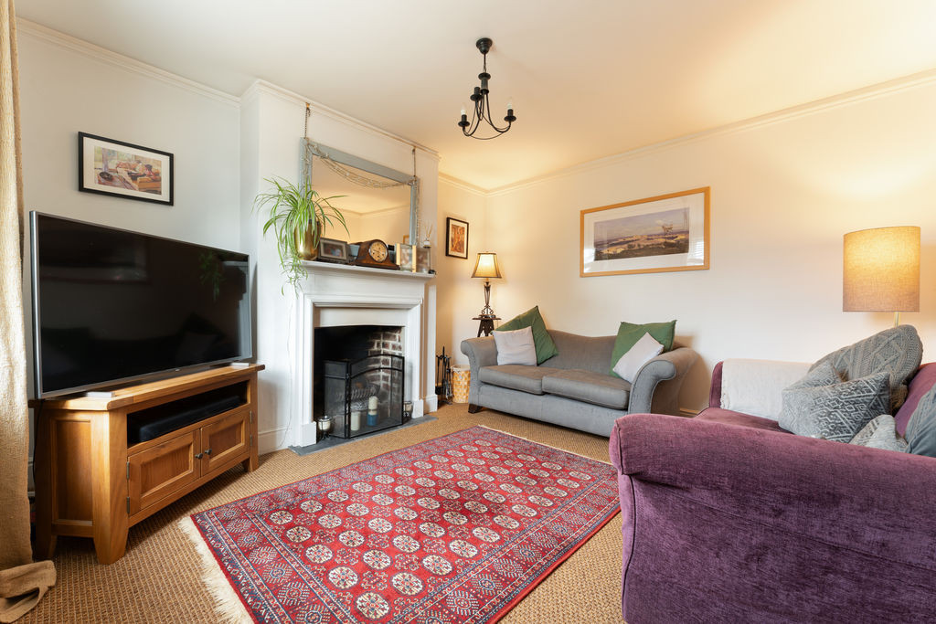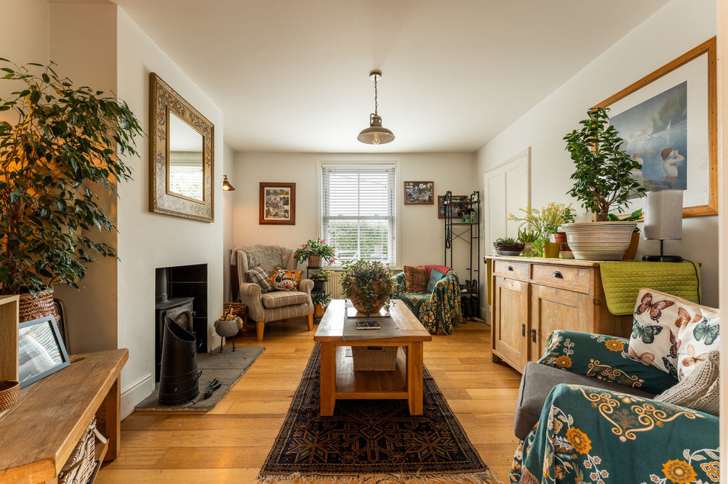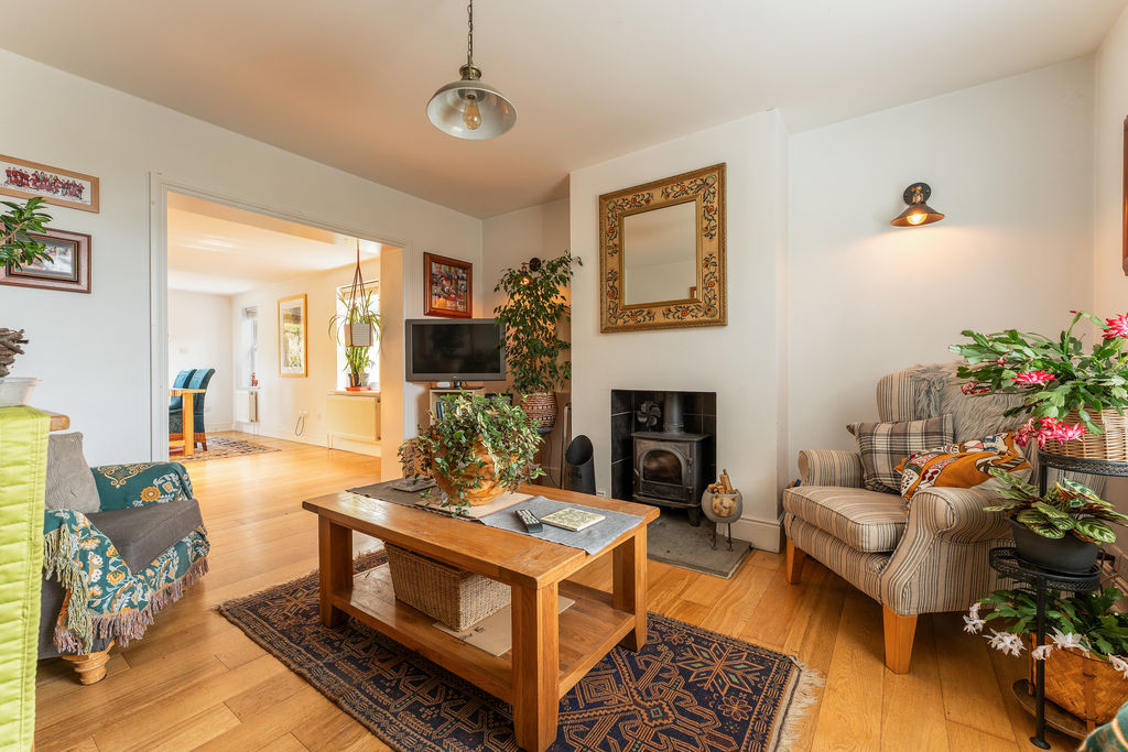 Approached via an entrance porch designed in keeping with the original cottage, the front door opens into a welcoming entrance hall, where the original staircase rises to the first floor. From here, doors lead to the principal reception rooms and kitchen. The formal sitting room is a particularly inviting space, featuring a working open fireplace with original brick surround, slate hearth, and timber mantle, complemented by a sash window overlooking the front garden. A further reception room, currently arranged as a snug, also enjoys a front aspect and features a wood-burning stove, providing a cosy and versatile living space.