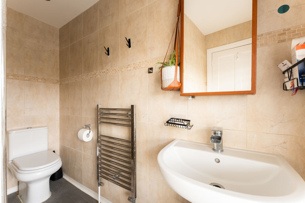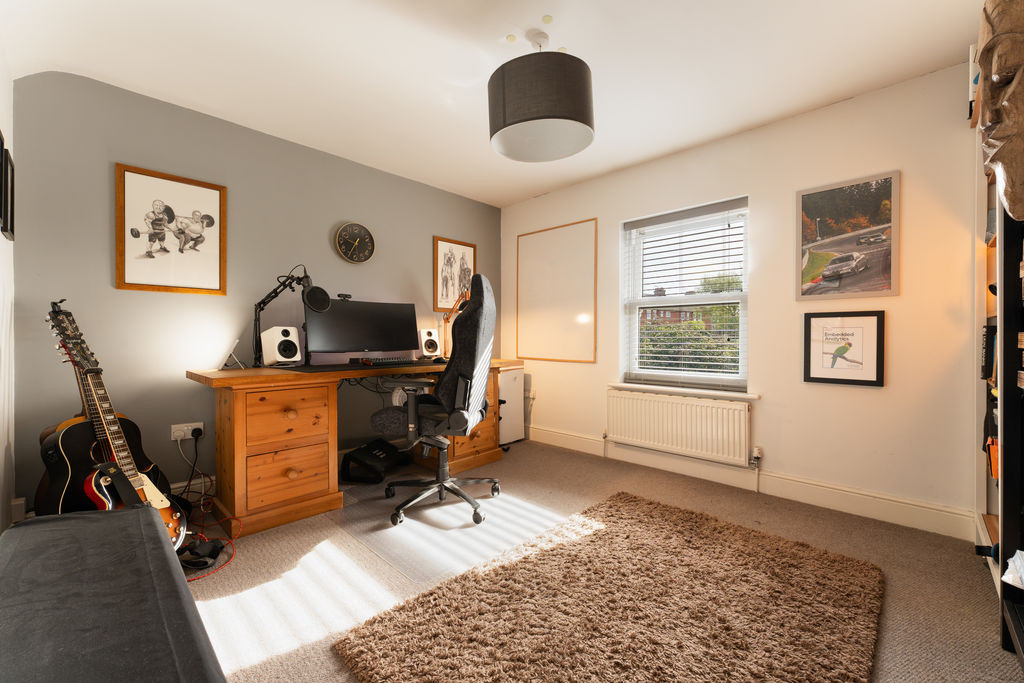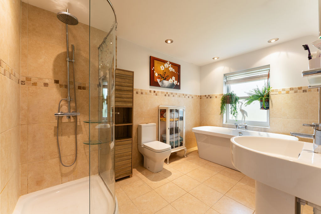 Upstairs, a spacious landing leads to four double bedrooms. The principal bedroom enjoys a pleasant outlook over the front garden and benefits from built-in wardrobes and a well-appointed en-suite shower room. The remaining bedrooms are all generously proportioned, offering flexibility for family living, guest accommodation, or home working. The family bathroom is finished to a high standard, featuring a freestanding bath, a large walk-in shower with rainfall head, and contemporary fittings throughout.